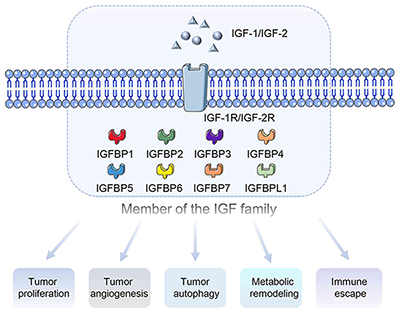 IGF ailesi esas olarak iki düşük molekül ağırlığındaki protein (IGF-1 ve IGF-2), karşılık gelen reseptörler (IGF-1R ve IGF-2R) ve spesifik bağlama proteinlerinden oluşur. 1963 yılında Froesch ve ark. serumda insülin antikorları tarafından tamamen engellenemeyen bir aktif madde varlığını keşfetti; bu madde daha sonra Rinderknecht ve Humbel adlı iki bilim adamı tarafından saflaştırıldı ve IGF-1 ve IGF-2 olarak adlandırıldı. İnsülin Benzeri Büyüme Faktörü 1 (IGF1) ve İnsülin Benzeri Büyüme Faktörü 2 (IGF2), reseptörleri olan İnsülin Benzeri Büyüme Faktörü 1 Reseptörü (IGF1R)'ye bağlanabilir ve ardından insülin reseptör substratlarını fosforile ederek ve fosfatidilinozitol 3-kinaz (PI3K) ile büyüme faktörü reseptörü bağlı protein 2 ilişkili protein (Grb2)'ye bağlanarak aşağı akış kaskadlarını tetikler, böylece iki önemli sinyal yolu aktive olur: (1) Mitojen ile aktive olan protein kinaz (MAPK) yolu, esasen transkripsiyon ve metabolizmada çeşitli yanıtları indükler ve hücre büyümesini, hayatta kalmasını ve farklılaşmasını düzenler. (2) PI3K yolu, hücre hayatta kalması, büyümesi ve çoğalması ile birlikte protein sentezinde rol oynar.