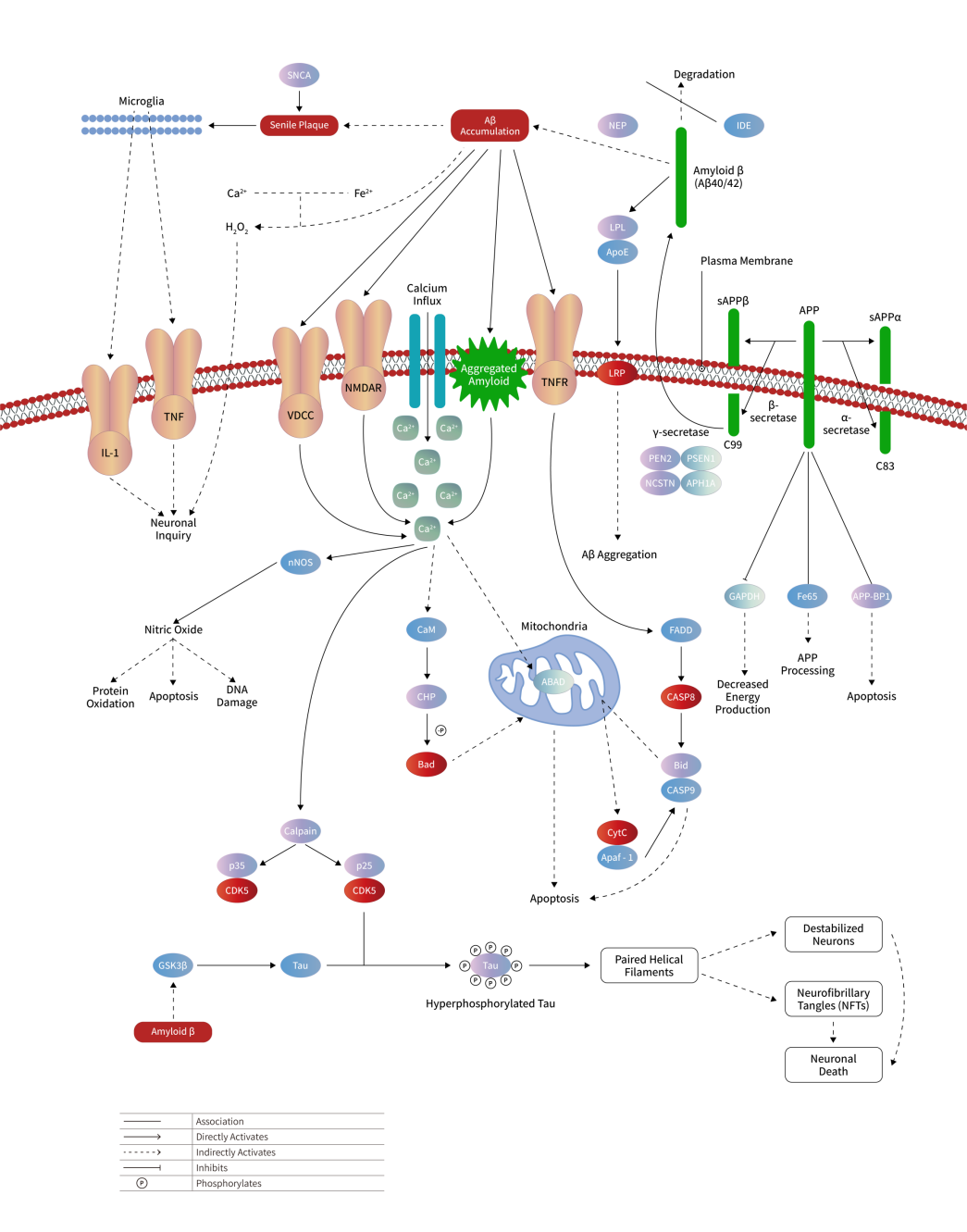 Aβ, "amiloid öncü protein (APP)"den iki proteaz, β-sekretaz ve γ-sekretaz tarafından parçalanmasıyla üretilen kısa bir peptiddir. AH hastalarında, Aβ üretimi ve temizlenmesi arasında bir dengesizlik vardır - bu, APP genindeki mutasyonlardan (örneğin, erken başlangıçlı AH'deki APP mutasyonları) kaynaklanan Aβ'nin aşırı üretimi ve birikmesine veya temizlenme verimliliğinin azalmasına (örneğin, APOE ε4 gen etkilerine) yol açabilir. Bu birikimler doğrudan sinapsları (nöronlar arasında sinyal ileten "bağlantı noktaları") hasar edebilir, sinaptik disfonksiyona hatta kayba yol açabilir (sinaptik kayıp doğrudan hafıza kaybı ile ilişkilidir); nöronal hücre zarlarının stabilitesini bozabilir, anormal kalsiyum girişini indükleyebilir ve sinir sinyal iletimini engelleyebilir; mikroglia ("beyindeki bağışıklık hücreleri") ve kronik inflamasyonu tetikleyebilir [3].