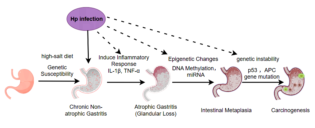 With the accumulation of mucosal damage, gastric mucosal cells gradually develop genetic mutations, chromosomal abnormalities, and epigenetic changes, ultimately leading to malignant phenotypes such as "unlimited proliferation, anti-apoptosis, and invasive metastasis".
