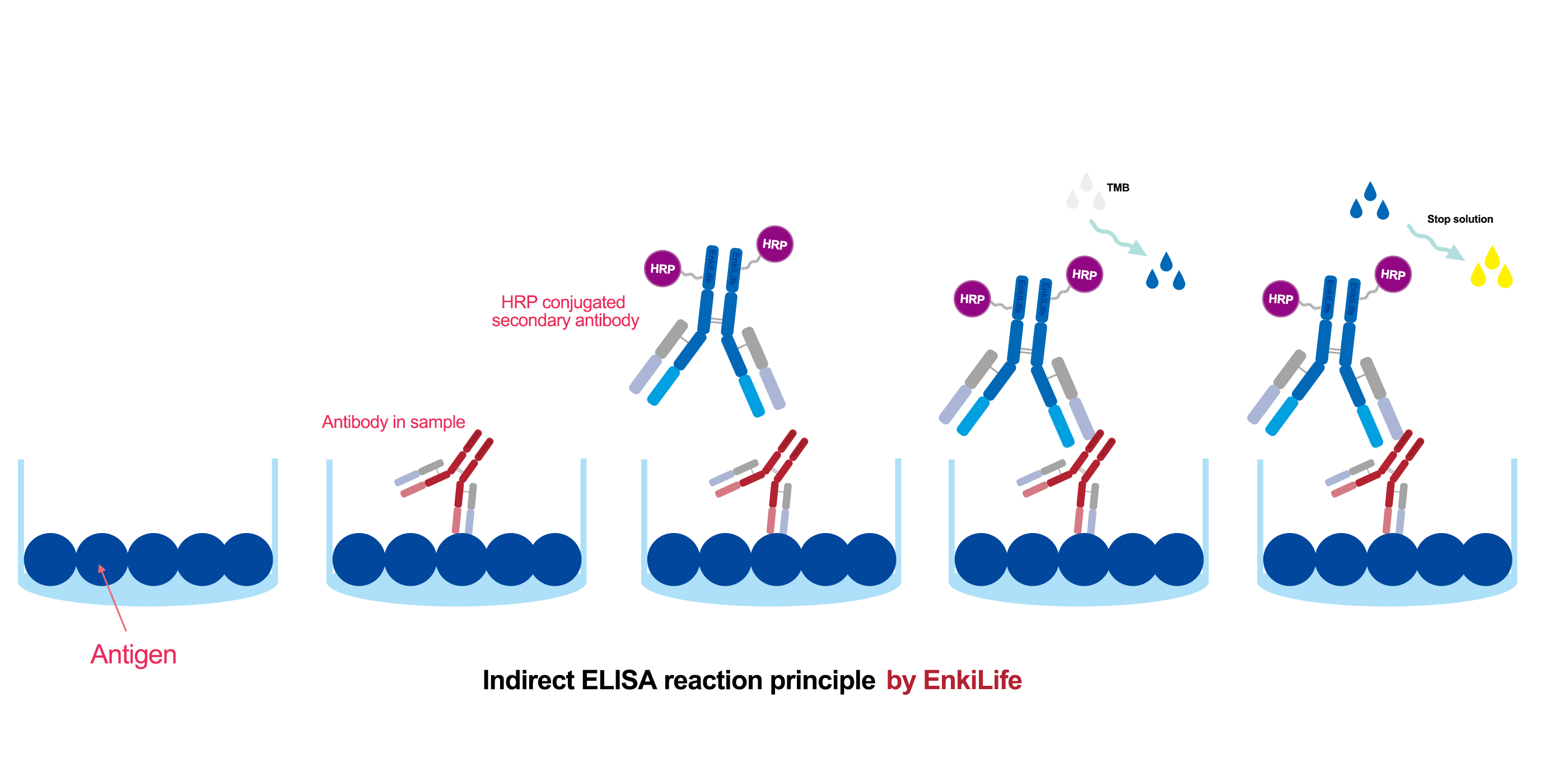 Dolaylı ELISA'da, bir birincil antikor molekülü birden fazla enzimle birleştirilmiş sekonder antikor molekülüne bağlanabilir, bu da yüksek duyarlılık, iyi esneklik ve düşük maliyet sunar. Yaygın olarak kullanılan ELISA türlerinden biridir, özellikle antikor tespiti için uygundur—örneğin serumdaki antikorların titrelerinin belirlenmesi.